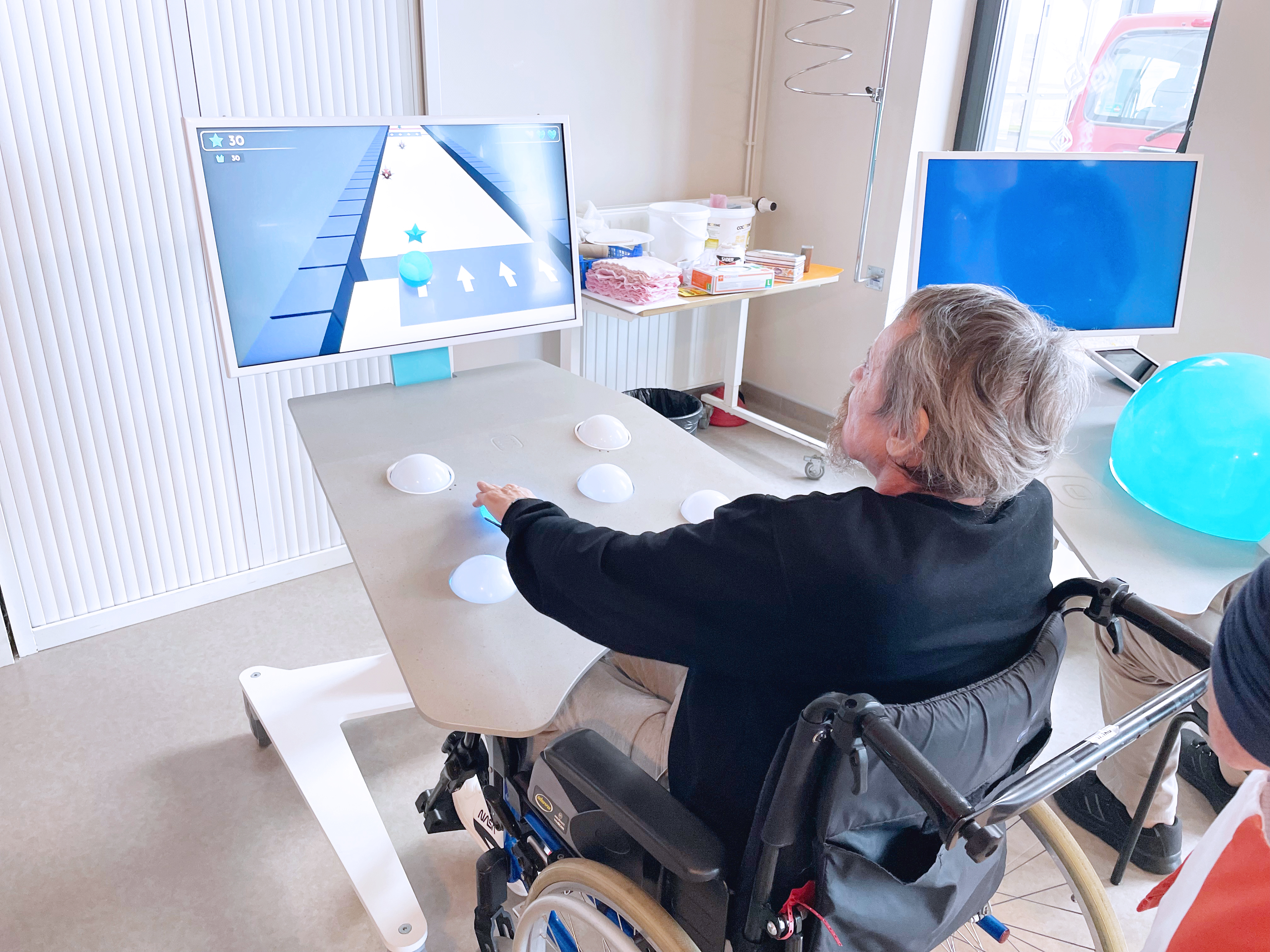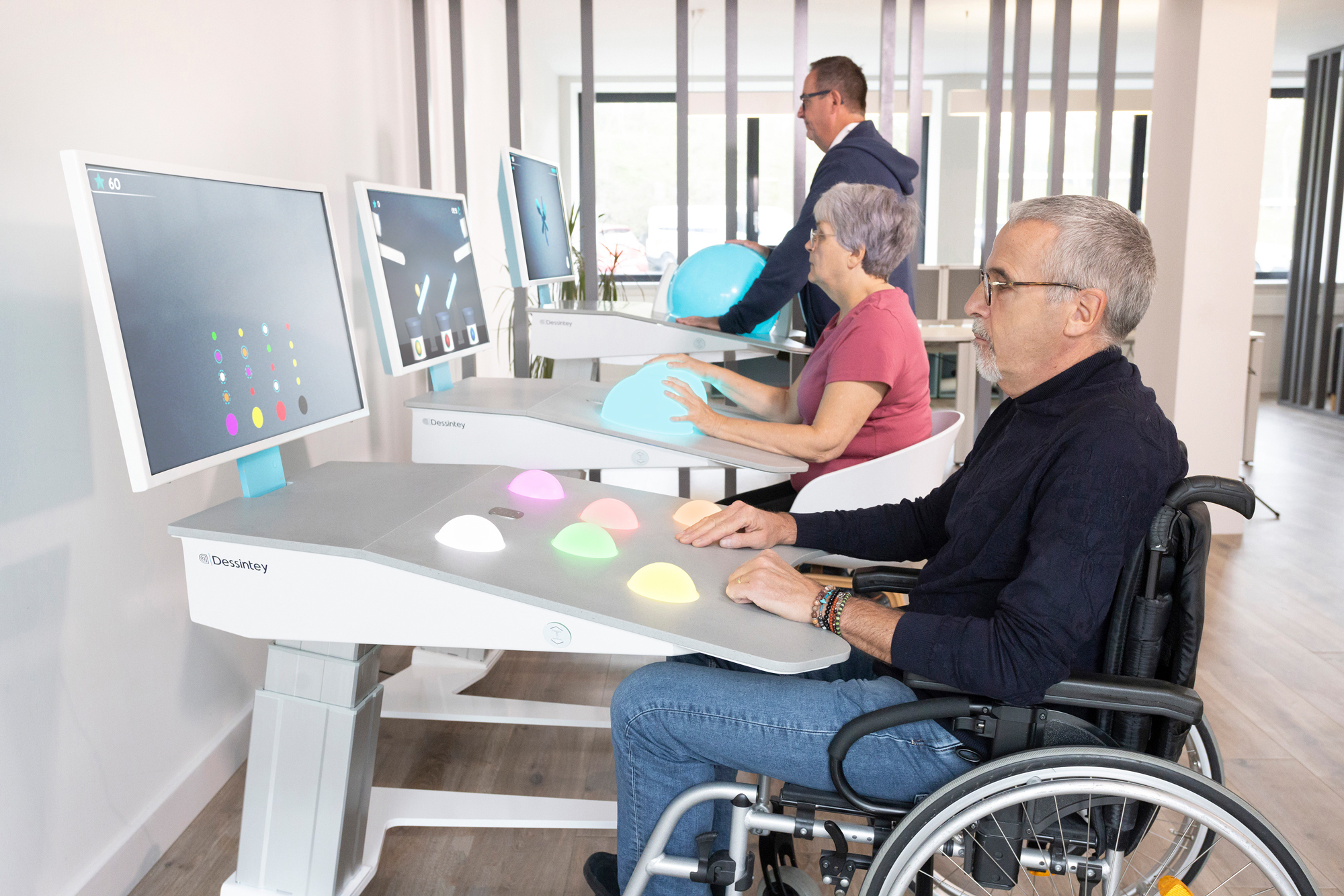 Self Rehabilitation Technology stimulates the patient in an intuitive and playful way with one or several spheres manipulated in a single or two-handed mode. These devices can be used outside conventional rehabilitation sessions: in a self-rehab lab or in supervised group therapy sessions.